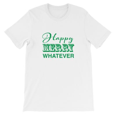 “HAPPY MERRY WHATEVER” | White T-Shirt with Green Design | Short-Sleeve Unisex T-Shirt