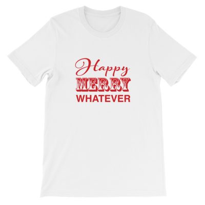 “HAPPY MERRY WHATEVER” | White T-Shirt with Red Design | Short-Sleeve Unisex T-Shirt