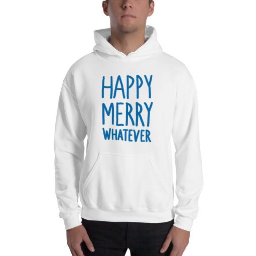 "HAPPY MERRY WHATEVER" (Handwritten) | White Long Sleeve Hooded Sweatshirt with Blue Design