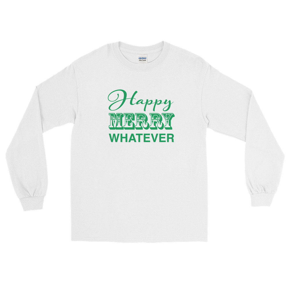 "HAPPY MERRY WHATEVER" | White Long Sleeve T-Shirt with Green Design